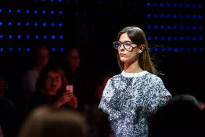 Konferencia fotózás Budapest egy nó beszél a színpadon, totálban fotózva az előtérben a kép alsó egyharmadában a közönség látszik hátulról.Konferencia fotózás Budapest egy nő beszédet tart a színpadon, felemelt mutatóujjal.